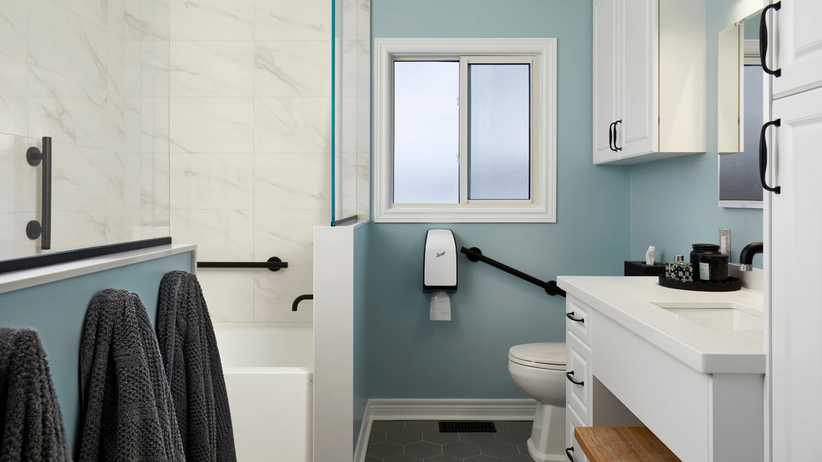Every daughter has her own element in this washroom. We built three individual shower niches into the design, one for each sister, providing personal storage without consuming floor space. We added full cabinetry storage to supplement the niches, and the bench seat that fits under the sink doubles as practical seating during hair care routines. We made a point of asking the right questions during the planning phase to find ways to reflect each sister's needs and personality through storage, plumbing, and colour choices. The result is a space that belongs to all three of them equally.